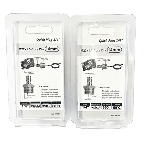 Bei Hochdruckreinigungsarbeiten ist die stabile Verbindung der Geräte sehr wichtig. Das Größendesign dieses 1/4 Zoll M22x1,5 Schnellverschlussstopfens ist sehr genau. Ein Ende ist ein 1/4 Stecker mit einem Durchmesser von 11,7 mm. Die Schnellsteckstruktur ermöglicht eine bequemere Verbindung und Demontage. Für Profis kann es die Arbeitseffizienz verbessern. Für normale Einzelbenutzer kann es den Prozess auch einfacher machen, ohne komplizierte Tools für die Installation zu benötigen. Das andere Ende ist ein M22×1,5-Stecker mit einem Durchmesser von 22 mm. Gleichzeitig können zwei Öffnungen ausgewählt werden: Kerndurchmesser 14 mm und Kerndurchmesser 14 mm. Die Standardgewindespezifikationen von M22×1,5 können mit einer Vielzahl von Reinigungsgeräten kombiniert werden. Es besteht kein Grund zur Sorge über die zusätzlichen Kosten, die durch die ungeeignete Schnittstelle entstehen, und die Kompatibilität ist stärker. Die Wahl zwischen zwei Blendenöffnungen von 14 mm oder 15 mm kann je nach Arbeitsbedarf gewählt werden und die Bedienung ist flexibler.
