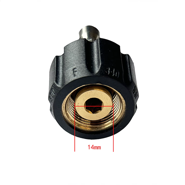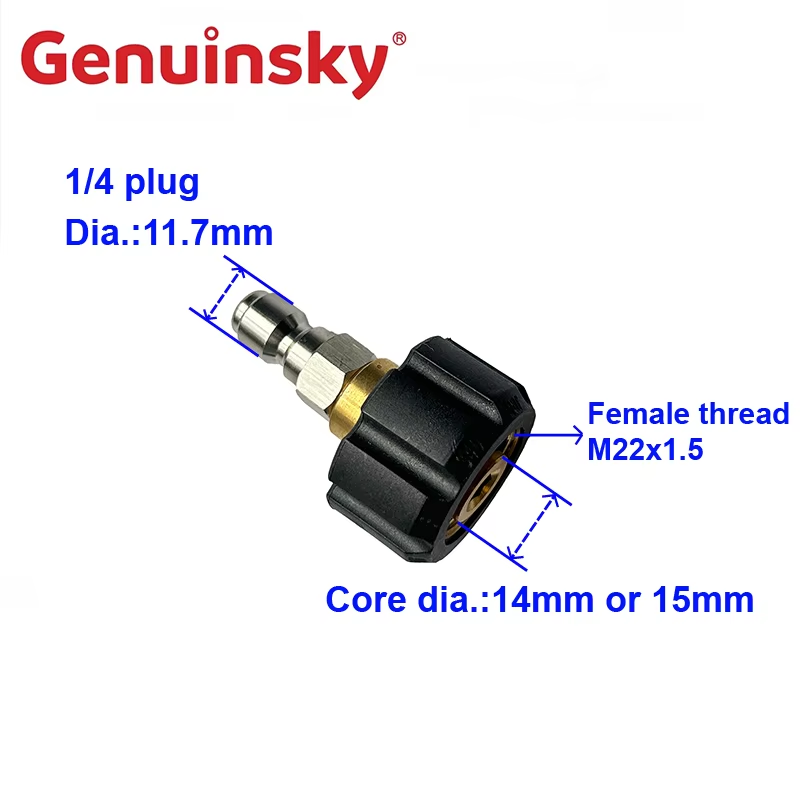 Dieses Produkt ist ein 1/4 Zoll schneller Stecker. Der Durchmesser des Schnellstopfens beträgt 11,7 m und das andere Ende ist M22 × 1,5 weiblicher Faden. Es stehen zwei Lochdurchmesser zur Auswahl, Core Dia.14mm oder 15 mm. Es wird in vielen Hochdruckreinigungsszenarien in der modernen Gesellschaft weit verbreitet.