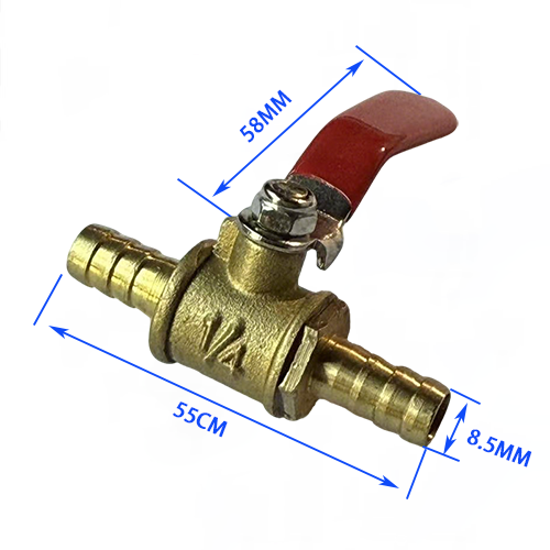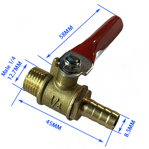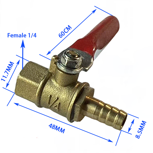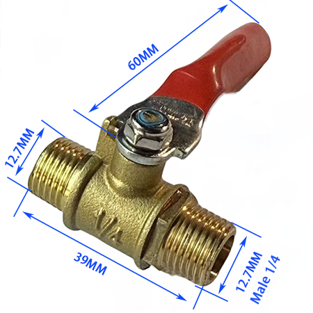 1. Außengewinde + Innengewindemodell, ein Ende des Produkts ist 1/4 Außengewinde mit einem Durchmesser von 12,7 mm und das andere Ende ist 1/4 Innengewinde mit einem Durchmesser von 11,7 mm, die Gesamtlänge des Ventilkörpers beträgt 34 mm und die Grifflänge beträgt 58 mm, die an Luftkompressoren angepasst werden kann. Die Verlegung von Rohrleitungen unterschiedlicher Durchmesser.