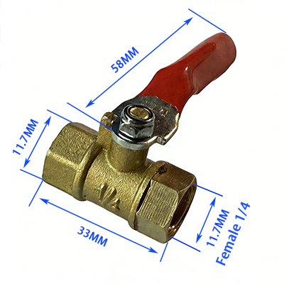 4. Typ mit doppeltem Innengewinde, beide Enden sind Innengewinde 1/4, der Durchmesser beträgt 11,7 mm, die Gesamtlänge des Ventilkörpers beträgt 33 mm und die Länge des Griffs beträgt 58 mm, was an das Andocken der Rohrleitung des engen Innenraums in der Ausrüstung angepasst werden kann.