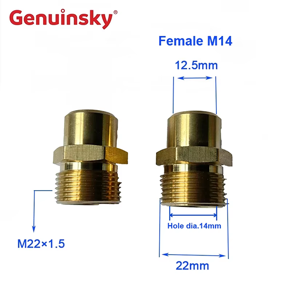 Messingrohranschläge für Hochdruckauto-Waschausrüstung. Beginnen wir zunächst mit der Größe des Produkts selbst. Ein Ende ist männlicher Gewinde M22 × 1,5 mit einem Durchmesser von 22 mm und einem Lochdurchschnitt. 14 mm. Am anderen Ende befindet sich der weibliche Faden M14 mit einem Durchmesser von 12,5 mm. Es kann mit geeigneten Hochdruckreinigungsmaschinen entsprechend den Bedürfnissen verwendet werden.