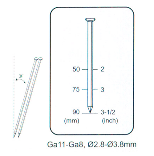 Die Nagelspezifikationen sind GA11-GA8 mit einem Durchmesser von 2,8 bis 3,8 mm und Längen von 50 mm, 75 mm und 90 mm (2 Zoll, 3-Zoll, 3-1/2-Zoll). Der Neigungswinkel der Nagelanordnung beträgt 34 Grad. Die Nagelliefe kann entsprechend den Arbeitsbedarf eingestellt werden.