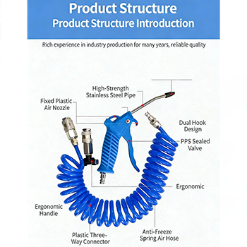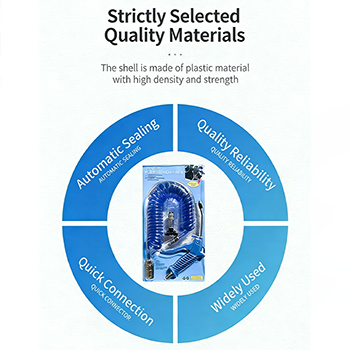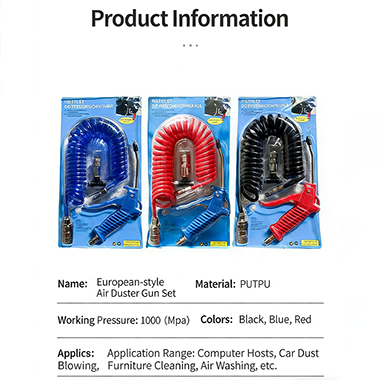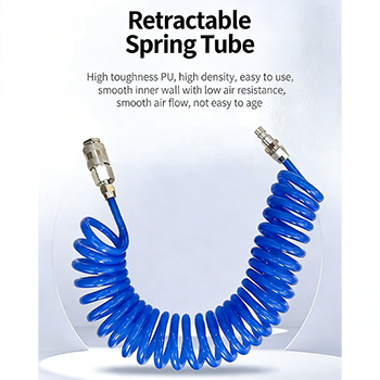 Die Teleskopfeder-Luftröhre im Anzug besteht aus PU-Material und es stehen drei Farben zur Auswahl: Schwarz, Blau und Rot. Die Innenwand des hochfesten PU-Materials ist glatt, wodurch der Windwiderstand geringer und der Luftstrom gleichmäßiger wird. Gleichzeitig weist das PU-Material eine hervorragende Verschleißfestigkeit und Alterungsbeständigkeit auf, und der Arbeitsdruck kann 1000 MPa erreichen, was für einen starken Luftstrom bei Staubentfernungsarbeiten sorgt und die Staubentfernungsarbeiten effizienter macht. Sehr praktisch sind auch die Schnellanschlüsse an beiden Enden der Luftröhre. Das Plug-in-Design erfordert kein Werkzeug und die Verbindung mit der Luftpistole und der Luftquelle kann in wenigen Sekunden hergestellt werden, was die Betriebseffizienz erheblich verbessert.