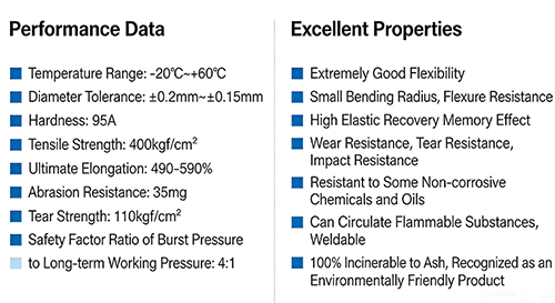 Zweitens kann aufgrund der Kernleistung der Arbeitstemperaturbereich des explosionsgeschützten Luftschlauchs aus hochreinem PU -20℃~60℃ abdecken, der Arbeitsdruck kann 10 kgf erreichen und der Sicherheitskoeffizient von Strahldruck und Arbeitsdruck beträgt 4:1. Er übertrifft die Grundstandards der Branche bei weitem und kann das Risiko von Rohrbrüchen unter Hochdruck-Einsatzszenarien vermeiden, sodass er sich an die überwiegende Mehrheit der industriellen Umgebungen anpassen kann.