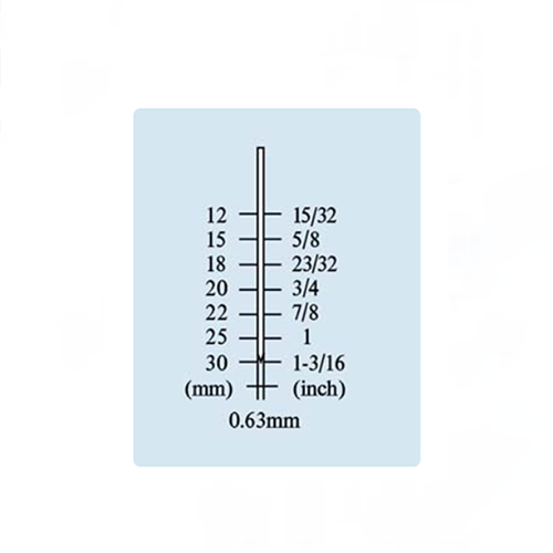 Der Nagel- oder Stiftgröße für MP630A-Luftmikropinner ist klein und dünn, Größe 12-30 mm (15/32 bis 1-3/16 Zoll), GA23, Dia. 0,63 mm.