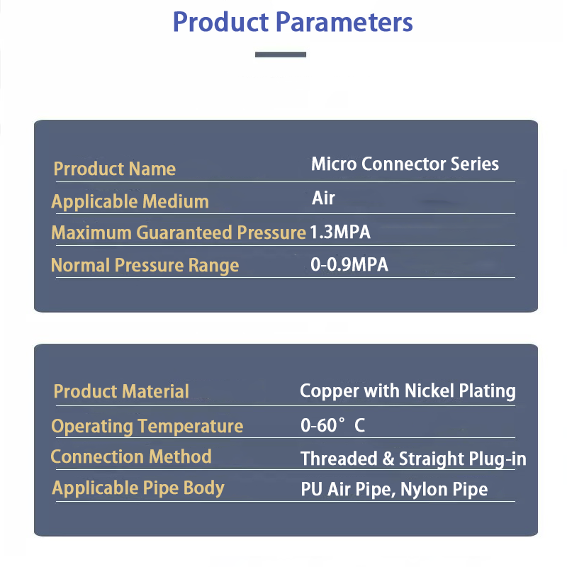 Der Toleranzbereich der Micro-Mini-Steckverbinderserie selbst liegt im Temperaturbereich von 0–60 °C. Darüber hinaus kann der maximale garantierte Druck 1,32 MPa erreichen, und der normale Arbeitsdruckbereich liegt zwischen 0 und 0,9 MPa. Dies deckt den stabilen Betrieb von pneumatischen Werkzeugen, automatisierten Zylindern und anderen Geräten, die Hochdruck-Arbeitsbedingungen erfordern, vollständig ab. Das Design der Micro Mini Connector-Serie passt sich genau den Anforderungen industrieller Betriebe an und kann an PU-Trachea- und Nylonschläuche angepasst werden, die zu den gängigsten Schläuchen auf dem Markt gehören. Das Design dieser Produktserie verleiht ihr eine hervorragende Dichtfunktion. Dem Gesamtdesign des Produkts nach zu urteilen, besteht das Verbindungsmaterial aus einem vernickelten Kupferventilkörper. Das vernickelte Kupfermaterial verfügt nicht nur über die hervorragende Abdichtung des Kupfermaterials, sondern auch über die gute Korrosionsbeständigkeit der vernickelten Schicht, sodass die Arbeit auch in einer feuchten oder staubigen Umgebung über einen langen Zeitraum aufrechterhalten werden kann. Die Stabilität der Arbeit ist nicht leicht zu rosten, was die Stabilität der Verbindung beeinträchtigt. Der Innenraum verfügt über einen speziellen konkaven Dichtungsring, der eine größere Kontaktfläche hat, sodass die Passform höher und die Abdichtung stärker ist. Gleichzeitig ist das Produkt selbst mit dem Standard-R-Gewinde des allgemeinen Industriegewindes ausgestattet. Gleichzeitig vermeidet die Kombination aus Standard-R-Gewinde und interner Verriegelungsfeder Verschleiß und Leckagen durch das Lösen von Teilen, was die Dichtungsarbeit doppelt schützen kann, was auch bedeutet, dass die Lebensdauer des Produkts erheblich verlängert wird. Abschließend wird das Gewinde der Micro Mini Connector-Serie mit PTFE-Kleber vorbeschichtet. Das Material Tetrafluorethylen selbst weist eine sehr gute chemische Stabilität und eine gewisse Gleitfähigkeit auf, was bedeutet, dass es die Dichtwirkung des Gewindes nicht nur optimieren, sondern in gewissem Maße auch reduzieren kann. Weniger Fadenverschleiß verlängert die Lebensdauer des Produkts zusätzlich. Vom Material bis zum Design soll bei der Micro Mini Connector-Serie eine gute Abdichtung erreicht werden, sodass unter den Hochdruck-Arbeitsbedingungen des Pneumatiksystems auch bei Hochfrequenzarbeiten die Dichtwirkung „tropfsicher“ aufrechterhalten werden kann.