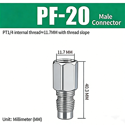 1. PF-20. Rohrgewinde 1/4, mit Gewindesteigung, der Durchmesser des Gewindeteils beträgt etwa 11,7 mm und die Gesamtlänge des Produkts beträgt 40,3 mm.