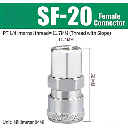 Die C-Typ-Schnellkupplungen der PF-SF-Serie von Genuinsky mit JIS-PT-Gewinde verfügen über eine C-Typ-Schnellverbindungsstruktur, die eine freie Paarung von männlichen und weiblichen Steckverbindern ermöglicht. Die galvanisierte Oberfläche und der Ventilkern aus Kupfer erhöhen die Haltbarkeit des Produkts. Als professioneller chinesischer Lieferant von Zubehör für Druckluftwerkzeuge produziert Genuinsky seine Produkte unter vollständiger Einhaltung der Standardisierung. Diese Serie bietet ein umfassendes Spektrum an Spezifikationen und ermöglicht eine präzise Anpassung an verschiedene pneumatische Rohrleitungen.
