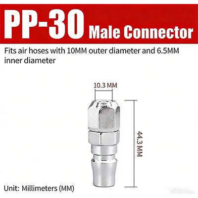 2. PP-30. Es ist für die Luftröhre mit einem Außendurchmesser von 10 mm und einem Innendurchmesser von 6,5 mm, mit einer oberen Breite von 10,3 mm und einer Gesamtlänge von 44,3 mm geeignet.