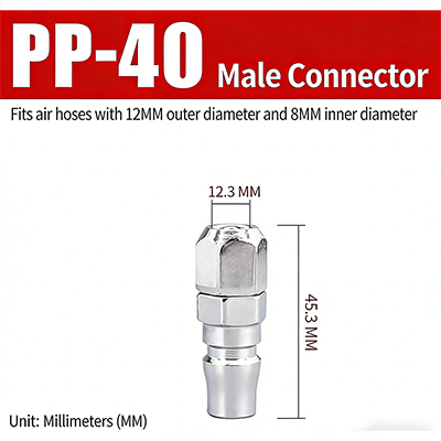 3. PP-40. Es eignet sich für die Luftröhre mit einem Außendurchmesser von 12 mm und einem Innendurchmesser von 8 mm, mit einer oberen Breite von 12,3 mm und einer Gesamtlänge von 45,3 mm.