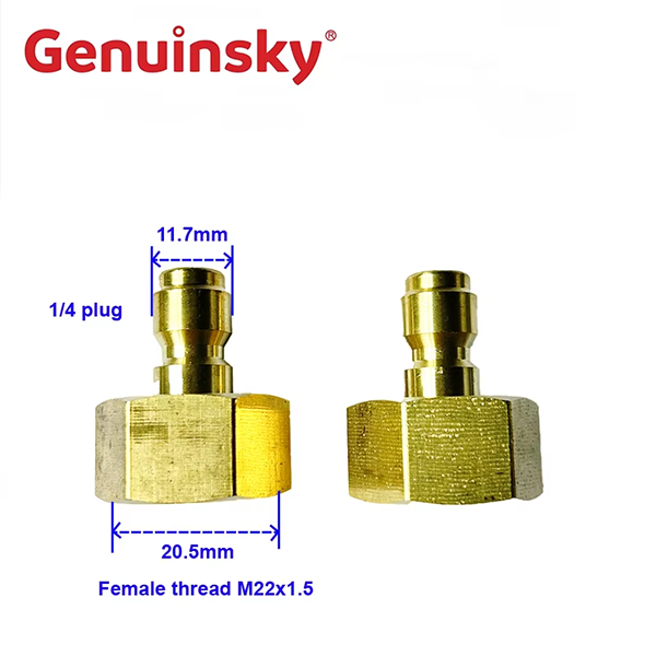Dieses Produkt ist ein schneller Stecker mit einem 1/4-Zoll-M22-Stecker mit einem 1/4-Stecker an einem Ende mit einem Durchmesser von 11,7 mm und einem weiblichen Gewinde-M22 × 1,5 am anderen Ende mit einem Durchmesser von 20,5 mm, der für die Reinigungsgeräte von Hochdruck-Waagen geeignet ist.