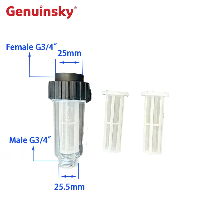 Dieser Wasserfilter für Karcher hat zwei Filternetze. Ein Ende ist ein weibliches G3/4 ", und der Durchmesser beträgt 25 mm. Das andere Ende ist männlicher G3/4" mit einem Durchmesser von 25,5 mm. Ningbo Genuinsky Company ist ein Unternehmen, das sich auf die Produktion von Accessoires für Autoreinigungen spezialisiert hat. Das Unternehmen integriert Fertigung, Entwicklung und Verkauf. Es verfügt über einen intimen After-Sales-Service, eine hervorragende Qualität und den Vorzugspreis. Im Laufe der Jahre hat es angenehme Transaktionen mit vielen Unternehmen durchgeführt. Sie können sicher sein, dass Sie es kaufen.